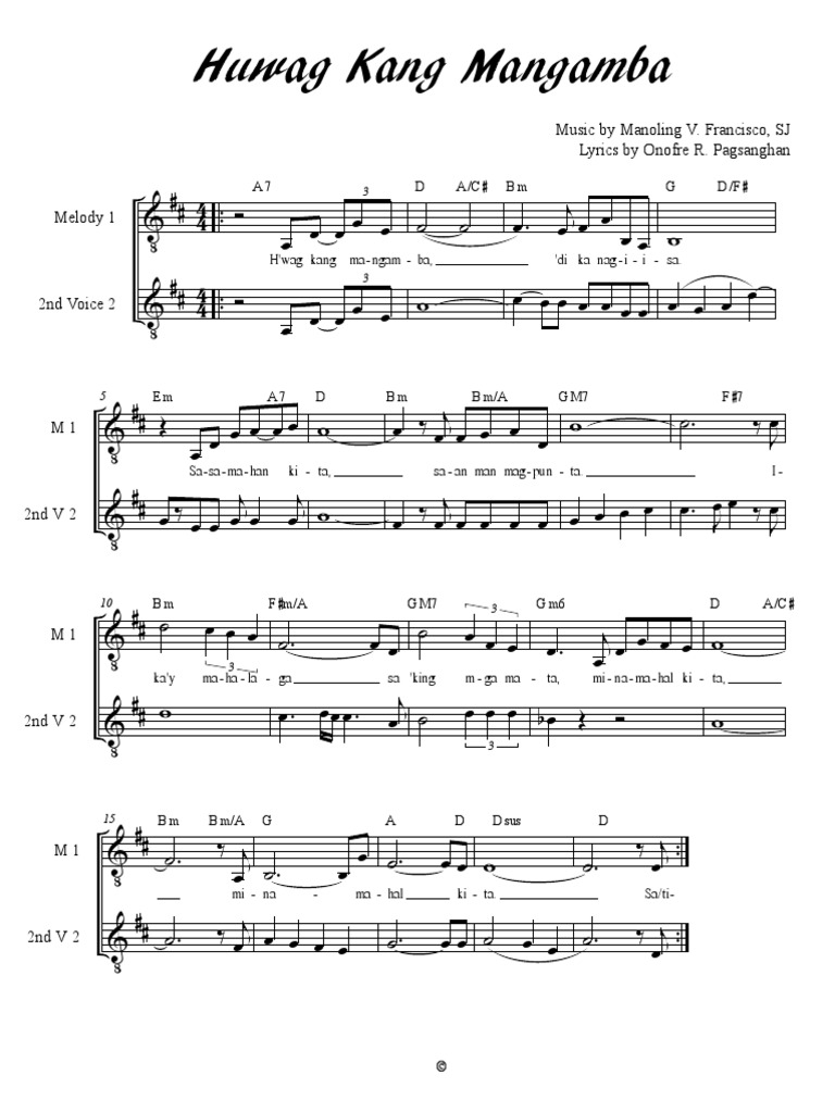 Huwagltunglllangamha--maran ki - ta sa-an man-magun -ta-sa-maran ki - ta sa-an man magpun -ta Sa-sa. G D Fm A B Am E Bm Em F G Cm Gm Chords for Huwag Limutin - Choral Arrangement SATB with song key BPM capo transposer play along with guitar piano ukulele. Download Huwag Kang Mangamba.